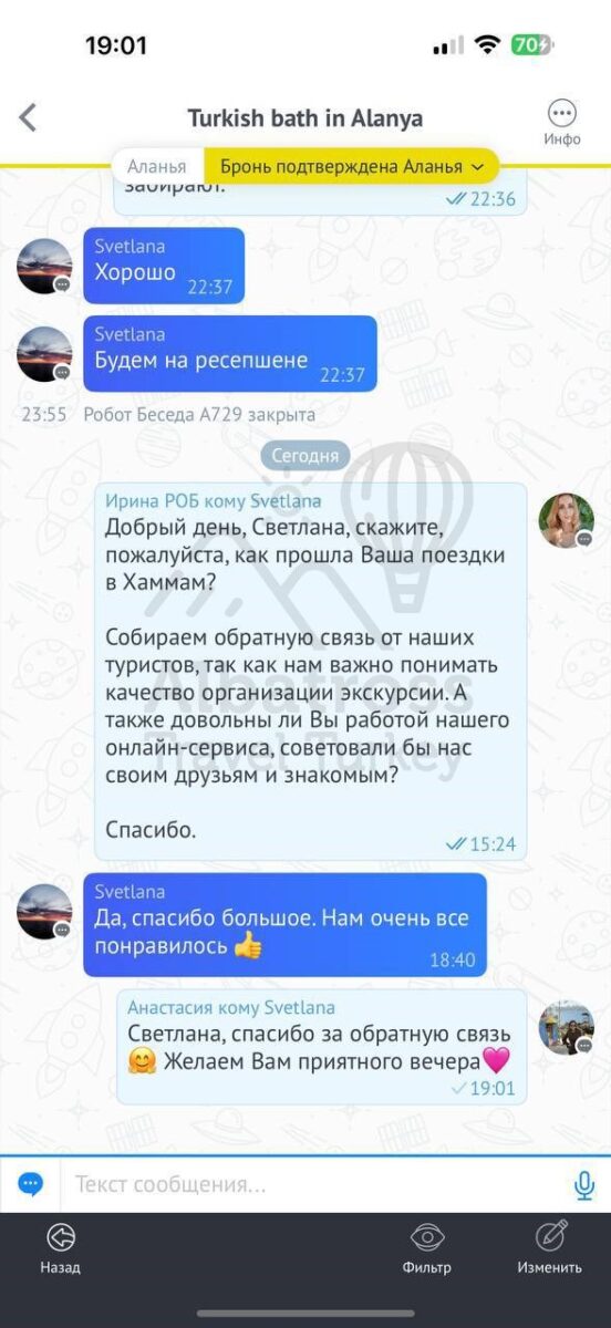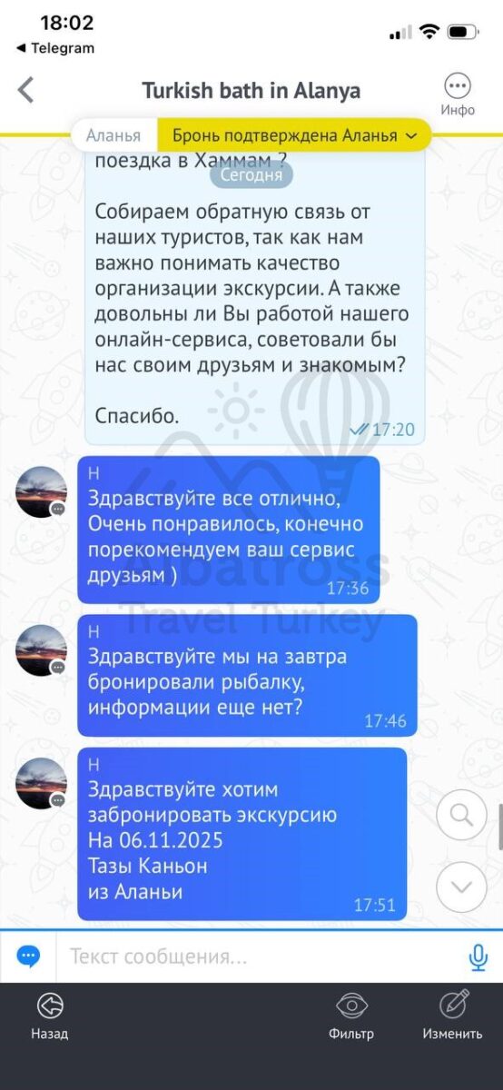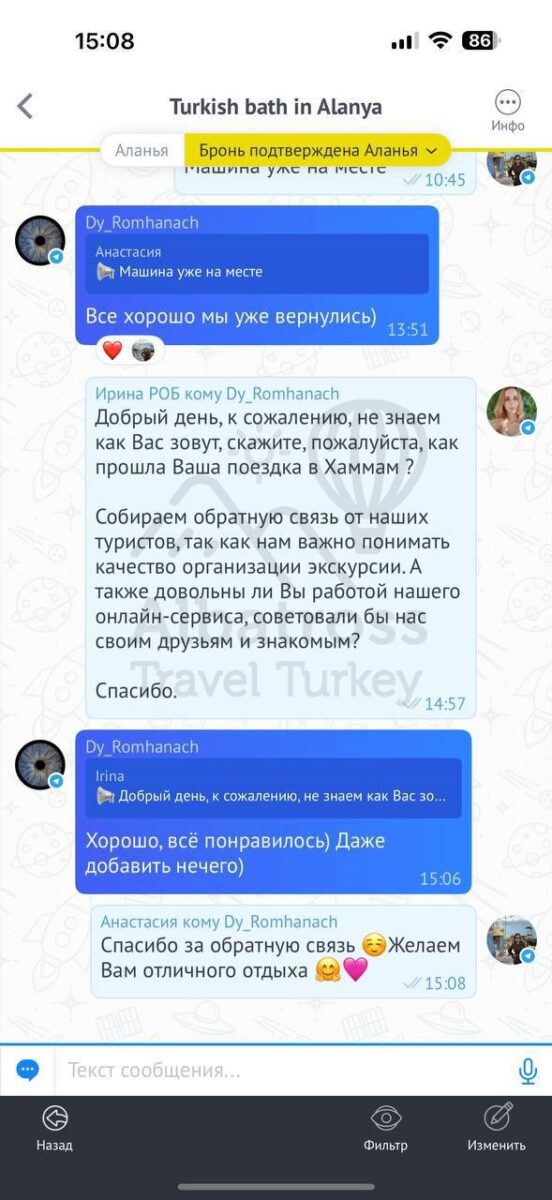 Турция — достаточная зарегулированная законами страна, особенно это касается туризма. Если у организаторов не будет лицензии на осуществление туристической деятельности. Именно поэтому на некоторые экскурсии мы можем у вас попросить данные или фото ваучеров и паспортов, это касается морских экскурсий, индивидуальных программ и некоторых групповых, если для этого требуется выезжать из города.
