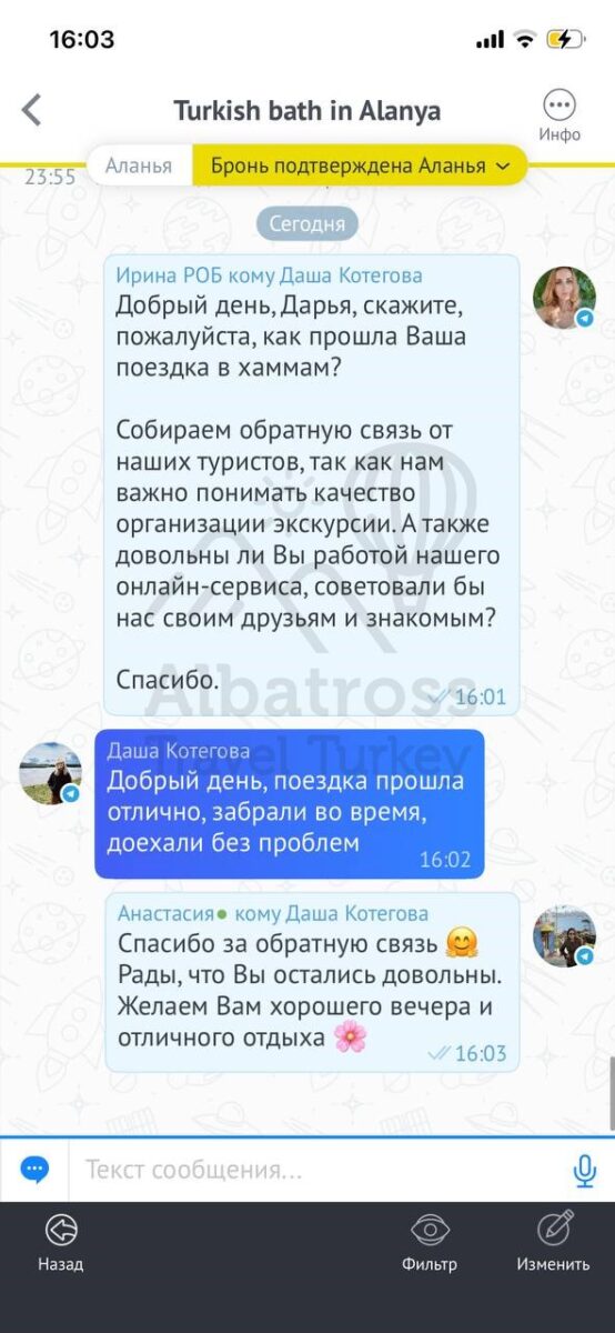 Оперативно встретили у отеля. Довезли до места, на месте все очень понятно объяснили. Во время процедур очень оперативно ориентировали по передвижениям: хаммам, паровая сауна, бассейн, пиллинг, массаж.