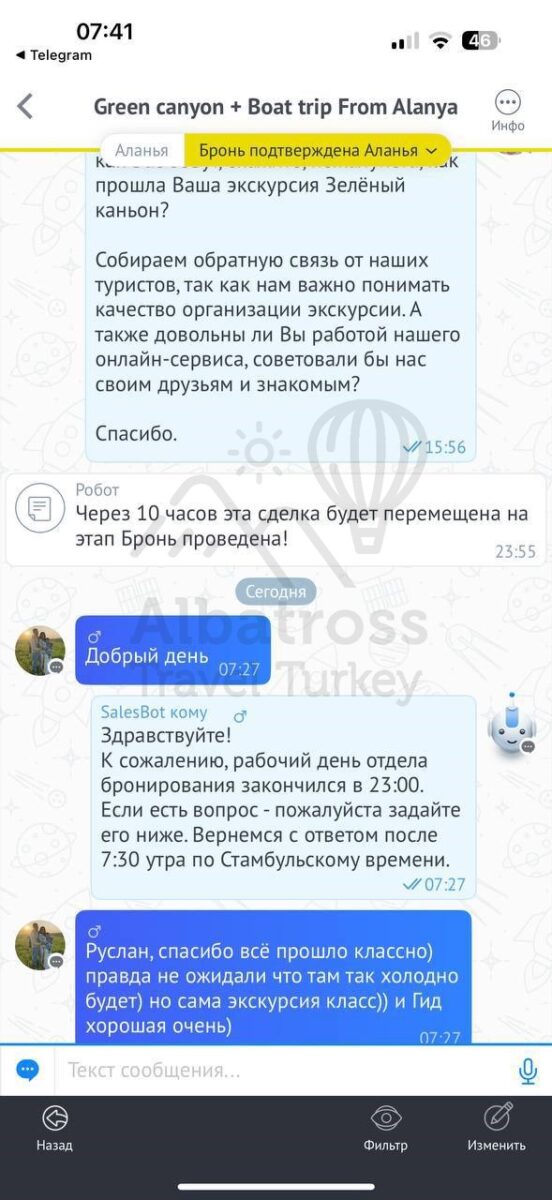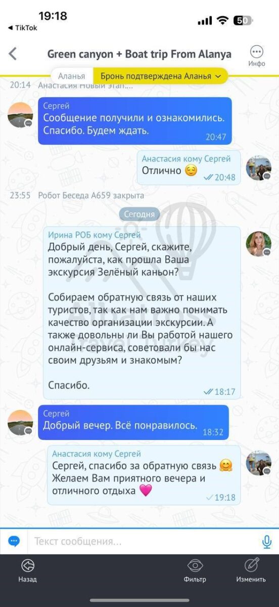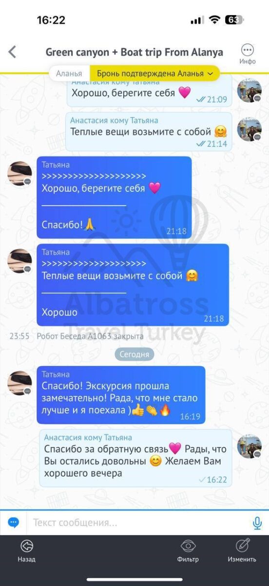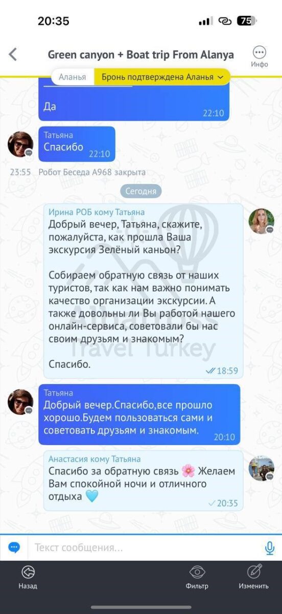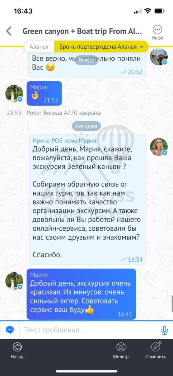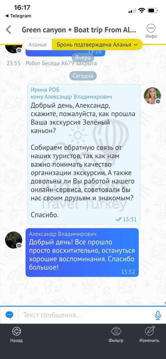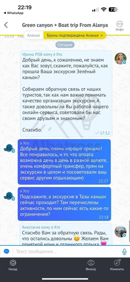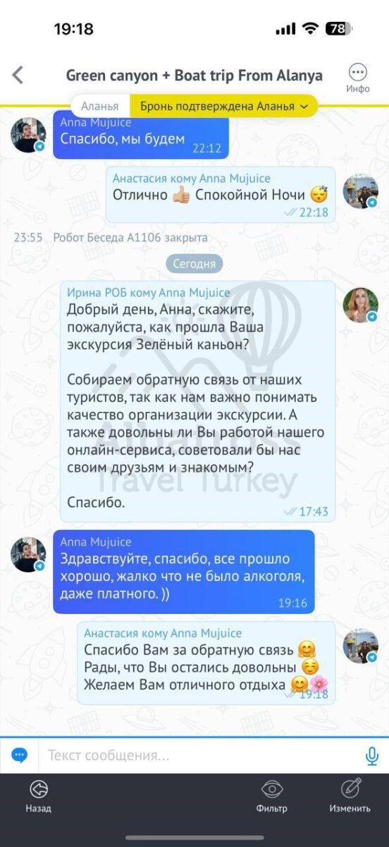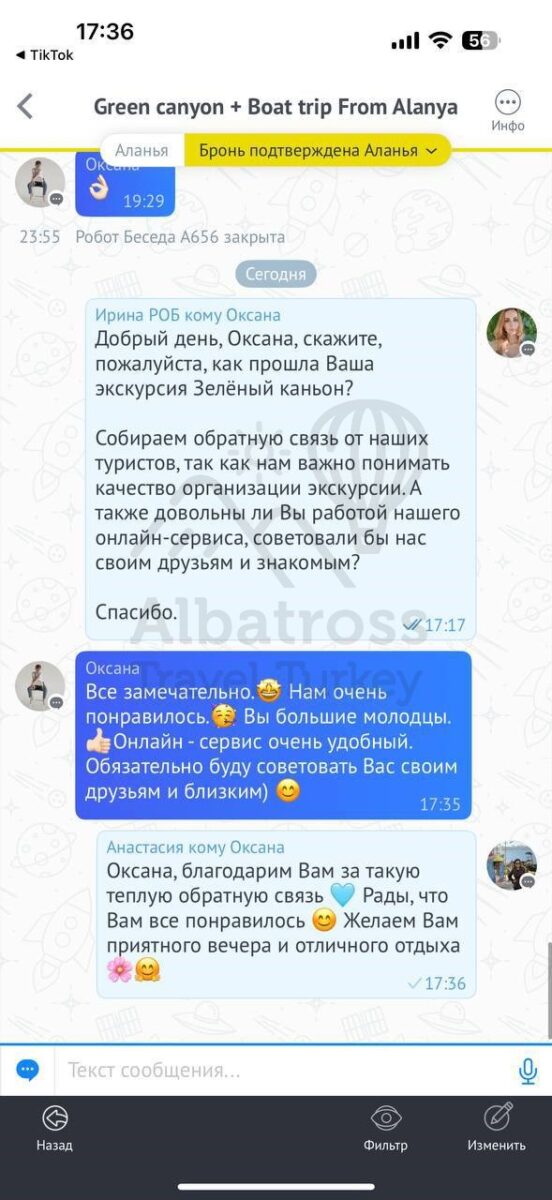 Все понравилось, и то, что оплата возможна день в день в разной валюте, очень комфортный трансфер, прям на экскурсии в целом и посоветовали ваш сервис другим отдыхающим)