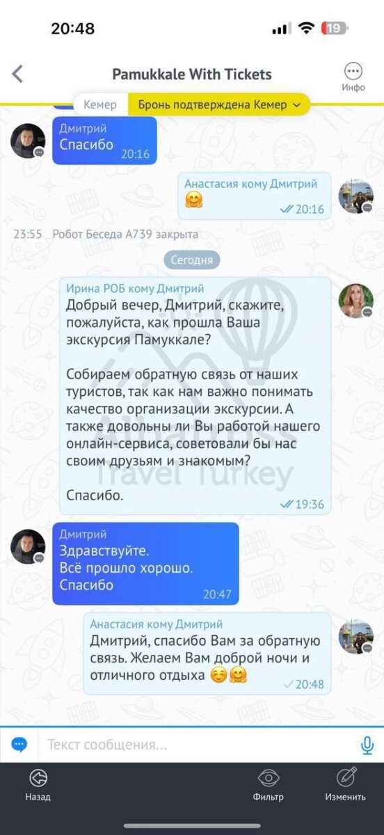 Турция — достаточная зарегулированная законами страна, особенно это касается туризма. Если у организаторов не будет лицензии на осуществление туристической деятельности. Именно поэтому на некоторые экскурсии мы можем у вас попросить данные или фото ваучеров и паспортов, это касается морских экскурсий, индивидуальных программ и некоторых групповых, если для этого требуется выезжать из города.