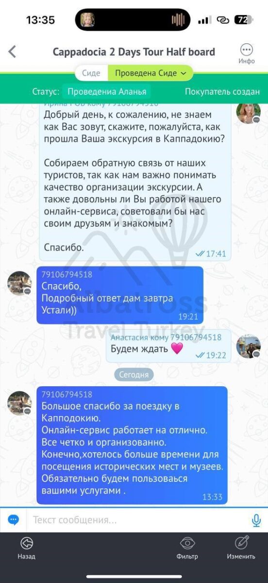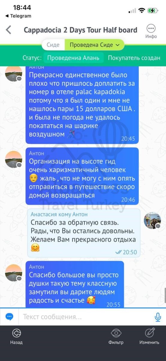 Прекрасно единственное было плохо что пришлось доплатить за номер в отеле palac kapadokia потому что я был один и мне не нашлось пары 15 долларов США . и была не погода не удалось покататься на шарике воздушном