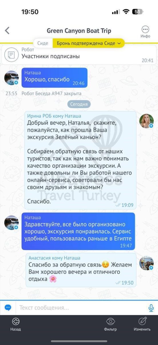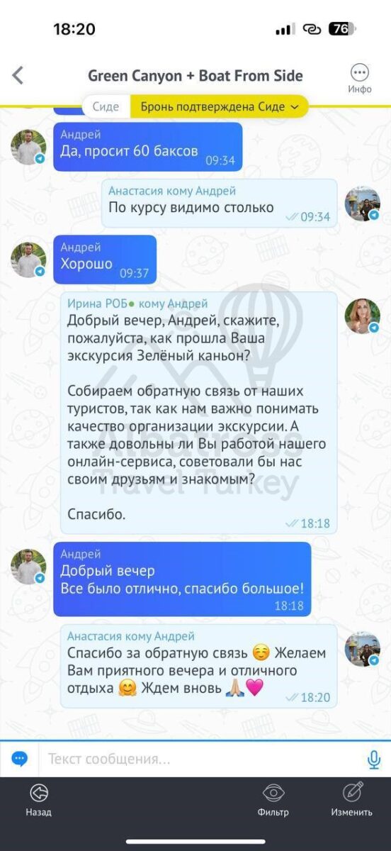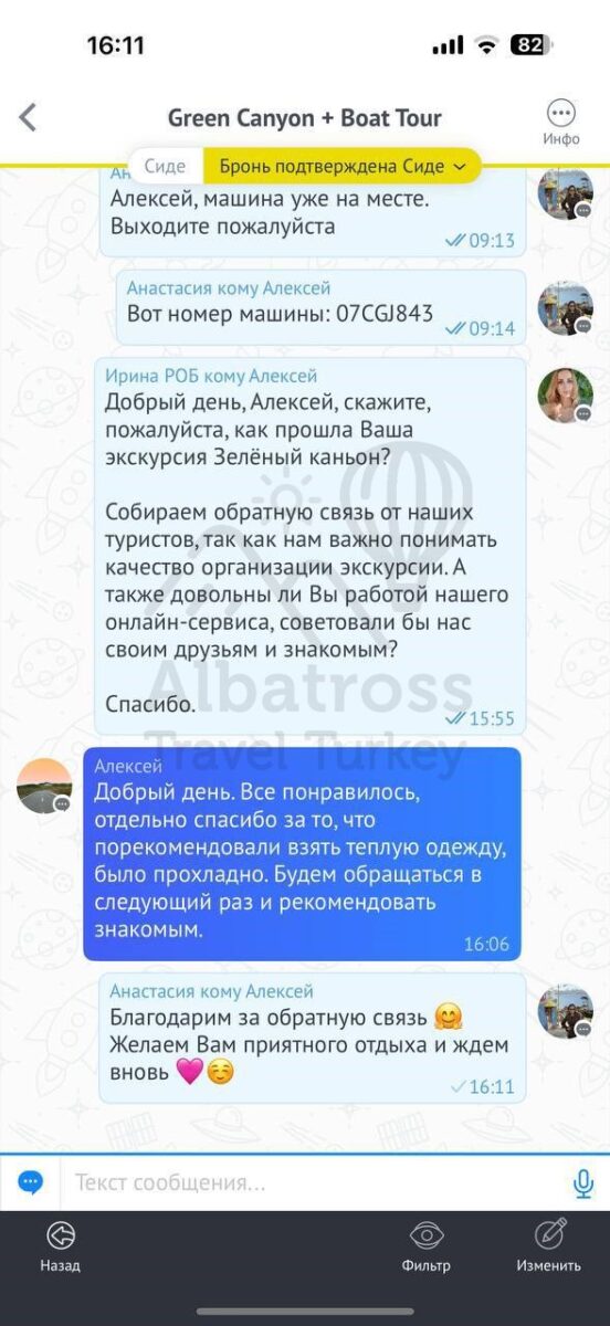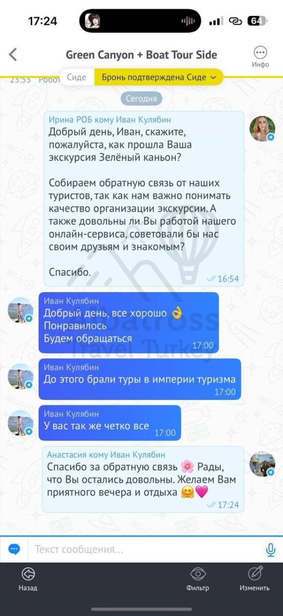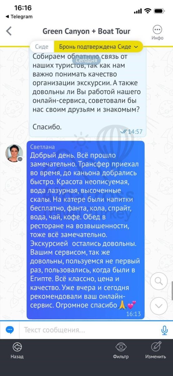 Добрый день. Всё прошло замечательно. Трансфер приехал во время, до каньона добрались быстро. Красота неописуемая, вода лазурная, высоченные скалы. На катере были напитки бесплатно, фанта, кола, спрайт, вода, чай, кофе. Обед в ресторане на возвышенности, тоже всё замечательно. Экскурсией остались довольны. Вашим сервисом, так же довольны, пользуемся не первый раз, пользовались, когда были в Египте. Всё классно, цена и качество. Уже вчера и сегодня рекомендовали ваш онлайн-сервис. Огромное спасибо